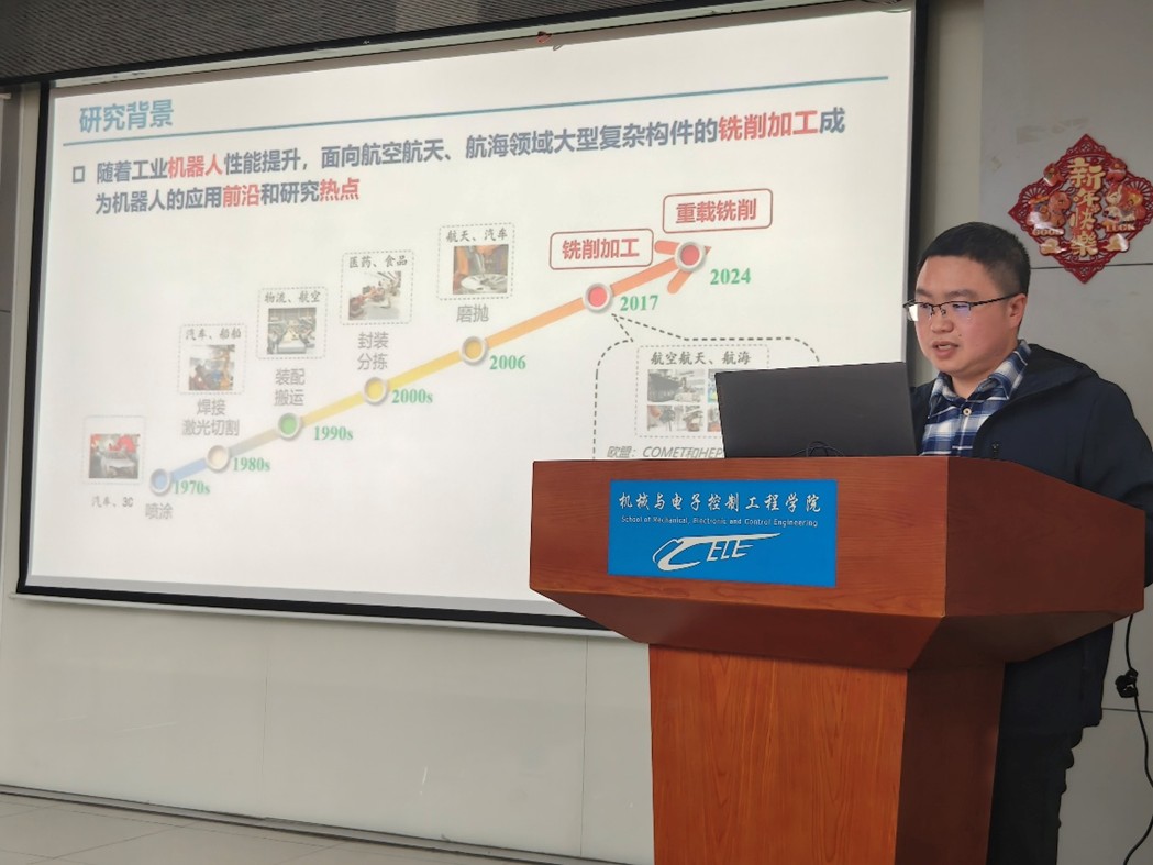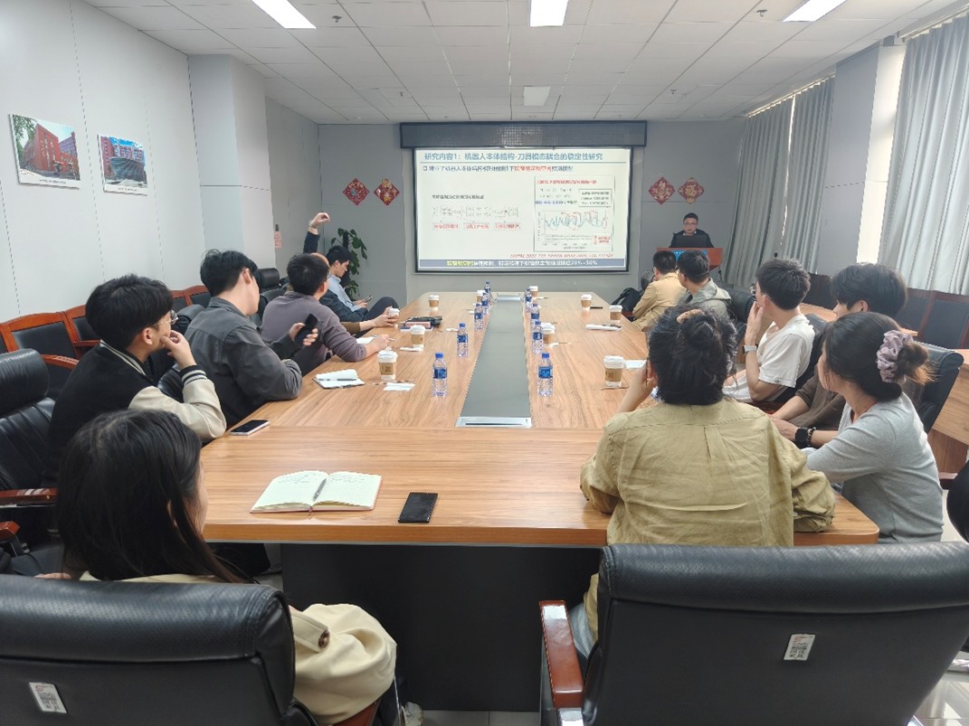 唐小卫教授从工业机器人弱刚性的固有特点切入,系统阐释了机器人铣削过程中模态耦合颤振与再生颤振的产生机理,介绍了团队在机器人加工动力学建模方面的工作。针对大型复杂构件的高精度加工需求,进一步分享了课题组在颤振抑制策略与精度控制方法方面的最新进展,并展示了相关研究成果在水轮机转轮、舰船螺旋桨等关键零部件在位加工中的应用实效。最后,围绕机器人加工数字孪生、机器人模仿学习等内容与师生展开交流。