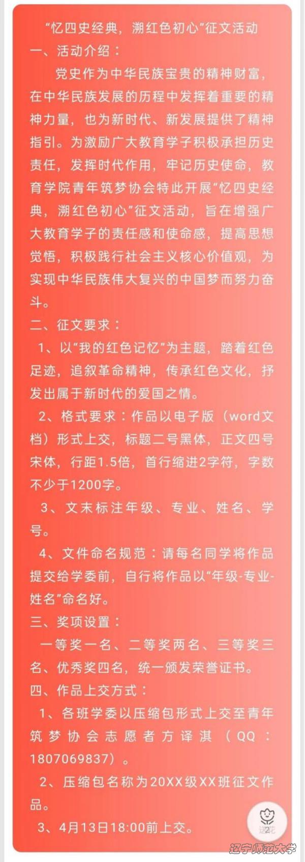 以“我的红色记忆”为主题进行征文,一段段刻骨铭心的红色记忆,不仅蕴藏着我们“从哪里来”的精神密码,更标定了我们“走向何方”的精神路标。通过此次征文活动,广大教育学子可以更直接的抒发自己的爱国之情,将初心和使命根植心中,不断汲取奋发的强大动力,让红色记忆永不褪色,更好地履行初心使命与责任担当。